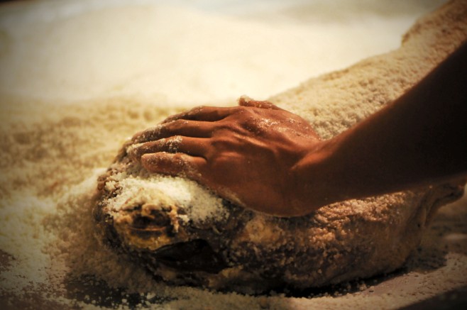 腌制火腿要使用大量的鹽,鹽并不是一次性倒入到火腿當(dāng)中的,而是要將鹽均勻地涂抹到肉腿上面。涂也不是一次性就能涂抹好,每條腿可能都要經(jīng)歷6—7次“美膚”和“按摩”的過程,最終表面結(jié)成白色的鹽霜,肌肉變得堅(jiān)硬緊實(shí)了才算可以了。第一次抹鹽叫做“上小鹽”,就是先將薄鹽抹在豬腿的表面,然后腌制一晚。第二次抹鹽叫做“上大鹽”,是在“上小鹽”的次日,這次要先將腌制出的血水用手?jǐn)D出,之后再均勻地涂上新的鹽。之后的上鹽均是在肉質(zhì)比較肥厚和筋骨相連的地方著重補(bǔ)鹽,時間則是在第7天、第13天、第27天。經(jīng)過這些次的鹽腌,整條豬腿均被食鹽腌透浸滿,腌的時候碼放也是有講究的,皮朝下肉朝上,最后一層則是皮朝上的。